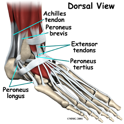 Ligaments on both sides of the ankle joint help hold the bones together. Many tendons cross the ankle to move the ankle and the toes. (Ligaments connect bones to bones while tendons connect muscles to bones.) The large Achilles tendon in the back is the most powerful tendon in the foot. It connects the calf muscles to the heel bone and gives the foot the power for walking, running, and jumping.