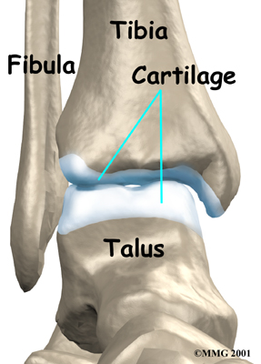 The ankle joint is made up of three bones: the lower end of the tibia (shinbone), the fibula (the small bone of the lower leg), and the talus (the bone that fits into the socket formed by the tibia and fibula).