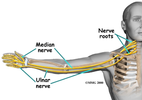 The ulnar nerve actually starts at the side of the neck, where the individual nerve roots exit the spine through small openings between the vertebrae. The then join together to form three main nerves that travel down the arm to the hand, one of which is the ulnar nerve.