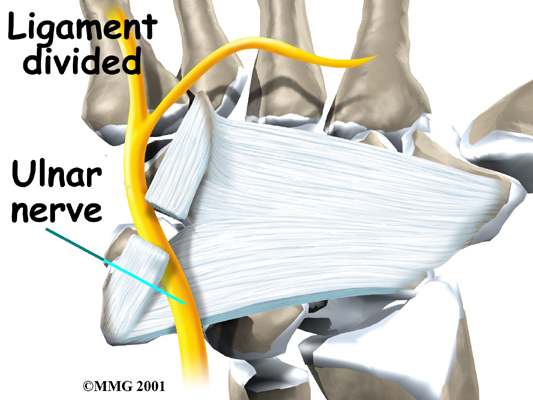 Care is taken to make sure that the ulnar nerve is out of the way and protected. By cutting the ligament, pressure is taken off the ulnar nerve.