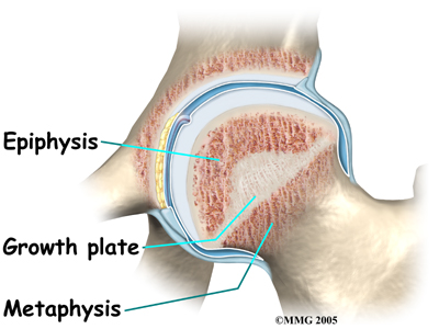 In the growing child, there are special structures at the end of most bones called growth plates. The growth plate is sandwiched between two special areas of the bone called the epiphysis and the metaphysis. The growth plate is made of a special type of cartilage that builds bone on top of the end of the metaphysis and lengthens the bone as we grow. In the hip joint, the femoral head is one of the epiphyses of the femur.