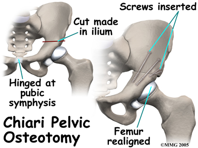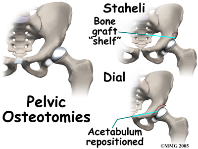 Realignment of the acetabulum is called a pelvic osteotomy. This procedure changes the angle of the acetabulum (socket) so that it better covers, or contains, the femoral head. To perform this procedure, an incision is made in the side of the buttock. The bone of the pelvis is cut and realigned in a new position. Large metal pins or screws are then inserted to hold the bones in the new position until the bone has healed. The pins usually must be removed once the bone has healed.