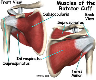 The shoulder joint is supported by many muscles. The most famous are the four rotator cuff muscles. They combine at the shoulder to form a thick cuff. They are also referred to as the SITS muscles. Each letter stands for one of the rotator cuff muscles; supraspinatus, infraspinatus, teres minor, and subscapularis. Sometimes injury to the quadrilateral space is mistaken as rotator cuff injury.