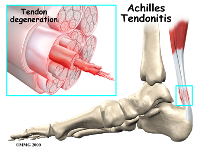 Insertional Achilles tendonitis refers to damage of the lower part of the tendon where it inserts (attaches) to the heel bone. This form of tendonitis is common in runners. Non-insertional Achilles tendonitis occurs when collagen fibers in the middle of the tendon begin to develop microscopic tears, usually due to wear and tear. Younger active individuals (athletes) tend to experience this type of tendonitis.