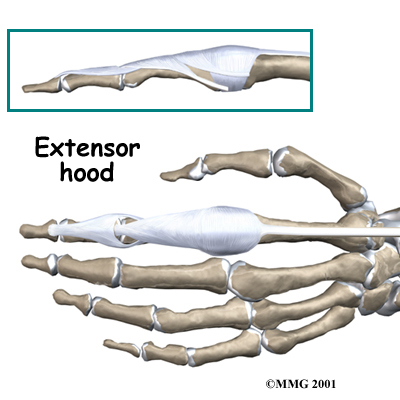 Ligaments are tough bands of tissue that connect bones together. Several small ligaments connect the extensor hood with other tendons that travel into the finger to bend the finger. These connections help balance the motion of the finger so that all the joints of the finger work together, giving a smooth bending and straightening action.