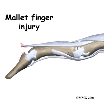 Clearly, PIP joint problems can produce a swan neck deformity. But so can problems that start in the DIP joint at the end of the finger. Injury or disease that disrupts the end of the extensor tendon can cause the DIP joint to droop (flex). An example from sports is a jammed finger that tears or ruptures the extensor tendon at the end of the finger (distal phalanx). Without treatment, the DIP joint droops and won't straighten out. This condition is called a . The extensor tendon may become imbalanced and begin to pull the PIP joint into hyperextension, forming a swan neck deformity.