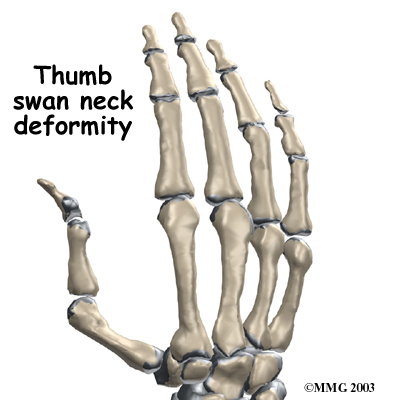 Conditions that loosen the PIP joint and allow it to hyperextend can produce a swan neck deformity of the finger. Rheumatoid arthritis (RA) is the most common disease affecting the PIP joint. Chronic inflammation of the PIP joint puts a stretch on the volar plate. (As mentioned earlier, the volar plate is a supportive ligament in front of the PIP joint that normally keeps the PIP joint from hyperextending.) As the volar plate becomes weakened and stretched, the PIP joint becomes loose and begins to easily bend back into hyperextension. The extensor tendon gets out of balance, which allows the DIP joint to get pulled downward into flexion. As the DIP joint flexes and the PIP joint hyperextends, the swan neck deformity occurs.