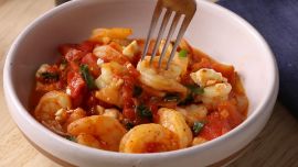 For this recipe you'll need olive oil, fresh onion, garlic, oregano, tomatoes, medium shrimp, feta cheese, parsley, and even a dash of white wine can be added for a little extra flavor.