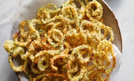 If you like fries, you’ll love this healthy take on the classic. Curly spirals of low-carb zucchini are coated with nutty parmesan cheese and baked to golden perfection.