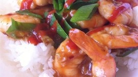 The recipe combines shrimp, ketchup, soy sauce, honey, cornstarch, vegetable oil, ground ginger, crushed red pepper, garlic, and green onions to create a simple, spicy dish.