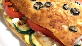 This vegetarian sandwich combines a variety of veggies including red bell peppers, zucchini, red onion, garlic, and yellow squash with mayo, lemon juice, and olive oil. All of the veggies are placed on delicious olive focaccia bread and topped with feta cheese. This delicious sandwich is a great alternative to a heavy meal during the summer and is packed with an array of vitamins and nutrients.