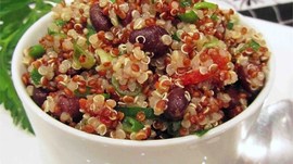 This salad combines quinoa with water, extra virgin olive oil, lime, black beans, cherry tomatoes, onions, and a variety of herbs and spices including fresh cilantro, cumin, red pepper flakes, salt and pepper. This healthy high-fiber salad is packed with a variety of vitamins and nutrients and can be ready in just 30 minutes.