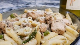 This recipe combines penne, chicken breast halves, and asparagus spears with olive oil, chicken broth, garlic powder, salt and pepper, and Parmesan cheese to create a quick and nutritious dinner option. This dish is full of protein and fiber as well as a variety of vitamins and nutrients, and can be ready in about 35 minutes.