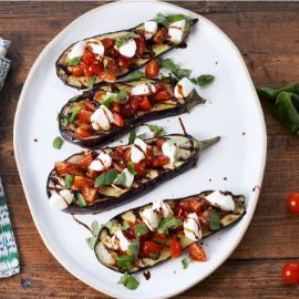 This recipe combines eggplant, cherry tomatoes, mozzarella, basil, ground pepper, and olive oil.
