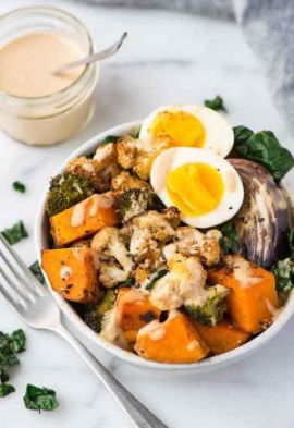 This nutritious bowl combines red onion, sweet potatoes, chili powder, extra-virgin olive oil, broccoli, kale, cumin, and garlic.