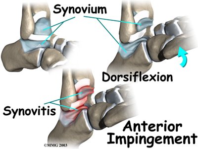 Pinching of tissues in the front of the ankle is called anterior impingement. Athletes who have had several mild ankle sprains or one severe sprain are most likely to have anterior impingement. This is especially true for athletes who repeatedly bend the ankle upward (dorsiflexion), such as baseball catchers, basketball and football players, and dancers. Over time, irritation along the front edge of the ankle can lead to impingement.