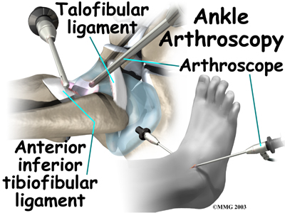 A fluoroscope is used to check for any remaining bony fragments. When the surgeon is satisfied that all bone fragments have been removed, the skin is stitched together. Patients are placed in a special splint designed to protect the ankle and to keep the foot from pointing downward.