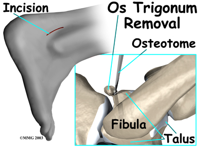 This surgery begins by placing the patient face down on the operating table. The surgeon makes a small over the lateral side of the back of the ankle, just behind the outer anklebone. A retractor is used to carefully hold the nearby tendons, nerves, and blood vessels out of the way. The surgeon locates the os trigonum. A scalpel is usually sufficient to dissect the os trigonum. However, if a bony bridge binds the os trigonum to the talus, the surgeon may need to use a chisel or osteotome.