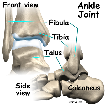 The ankle joint is made up of three bones: the lower end of the tibia (shinbone), the fibula (the small bone of the lower leg), and the talus (the bone that fits into the socket formed by the tibia and fibula).