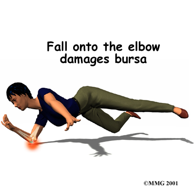 In some cases, a onto the elbow can damage the bursa. This usually causes bleeding into the bursa sac, because the blood vessels in the tissues that make up the bursa are damaged and torn. In the skin this would simply form a bruise, but in a bursa blood may actually fill the bursa sac. This causes the bursa to swell up like a rubber balloon filled with water.