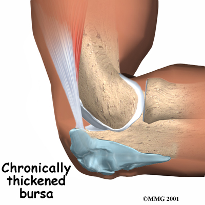 Olecranon bursitis can also occur over a longer period of time. People who constantly put their elbows on a hard surface as part of their activities or job can repeatedly injure the bursa. This repeated injury can lead to irritation and thickening of the bursa over time. The chronic irritation leads to the same condition in the end: olecranon bursitis.