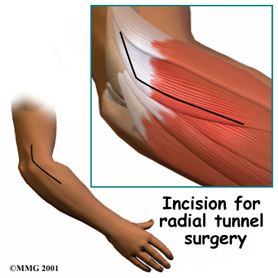 The goal of surgery for radial tunnel syndrome is to relieve any abnormal pressure on the nerve where it passes through the radial tunnel. The surgeon begins by making an incision along the outside of the elbow and down the forearm, near the spot where the radial nerve goes under the supinator muscle.