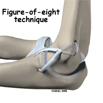 Another common technique to reconstruct the ulnar collateral ligament is the technique. In this technique, the tendon graft is threaded through two pairs of holes - two drilled in the medial epicondye and two in the ulna. The graft is looped through the holes in a figure of eight fashion. The two ends of the tendon are sutured to the tendon itself.