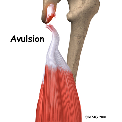 In rare cases, an injury can cause the muscle and tendons to tear away from the bone. This happens most often where the hamstring tendons attach to the ischial tuberosity. These tears, called , sometimes require surgery.