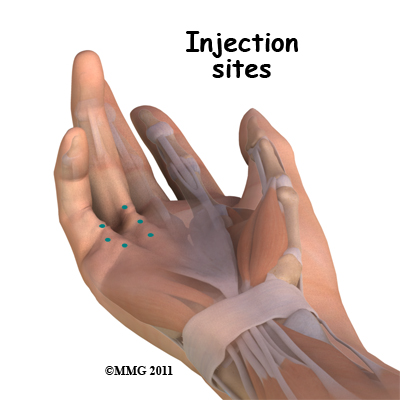 Ongoing research of this condition has resulted in a less invasive nonsurgical method of treatment called an enzymatic fasciotomy. If it is the main knuckle of the finger (at the base of the finger) that is contracted, and there are only one or two cords involved, this procedure may be possible. For this treatment, a new injectable drug, Xiaflex, which is gaining popularity and approval for use around the world, is used. By injecting an enzyme directly into the cords formed by the disease, the tissue dissolves and starts to weaken, most often the patients are able to break apart the cord by themselves.