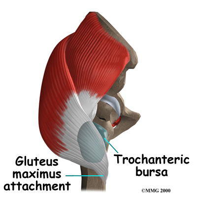 The gluteus maximus attaches to this long tendon. As you walk, the gluteus maximus pulls this tendon over the greater trochanter with each step. When the tendon is tight, it rubs against the bursa.