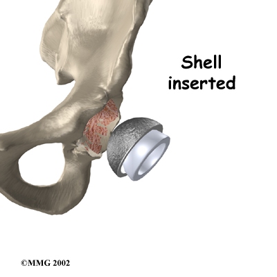 The surgeon shapes the socket into the form of a half-sphere. This is done to make sure the metal shell of the acetabular component will fit perfectly inside. After shaping the acetabulum, the surgeon tests the new component to make sure it fits just right.