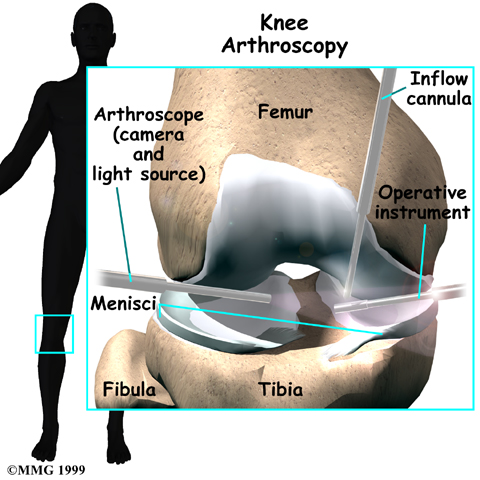 If the diagnosis is still unclear, arthroscopy may be necessary to actually look inside the knee and see if the joint surfaces are beginning to show wear and tear. Arthroscopy is a surgical procedure in which a small fiber-optic TV camera is inserted into the knee joint through a very small incision, about one-quarter of an inch long. The surgeon can move the camera around inside the joint while watching the pictures on a TV screen. The structures inside the joint can be poked and pulled with small surgical instruments to see if there is any damage.