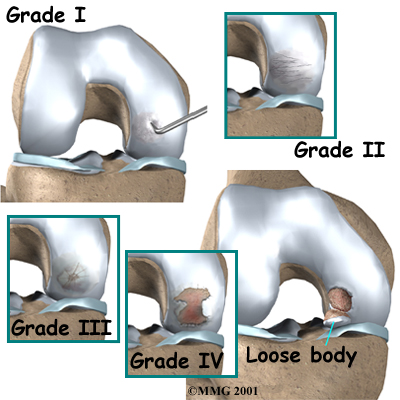 As the condition becomes worse, the area of bone that is affected may collapse, causing a notch to form in the smooth joint surface. The cartilage over this dead section of bone (the lesion) may become damaged. This can cause a snapping or catching feeling as the knee joint moves across the notched area. In some cases the dead area of bone may actually become detached from the rest of the femur, forming what is called a loose body. This loose body may float around inside of the knee joint. The knee may catch or lock when it is moved if the loose body gets in the way.