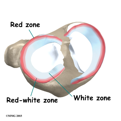 Most of the meniscus is avascular, meaning no blood vessels go to it. Only its outer rim gets a small supply of blood. Doctors call this area the red zone. The ends of a few vessels in the red zone may actually travel inward to the middle section, the red-white zone. The inner portion of the meniscus, closest to the center of the knee, is called the white zone. It has no blood vessels at all. Although a tear in the outer rim has a good chance of healing, damage further in toward the center of the meniscus will not heal on its own.