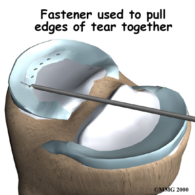 Repairs using suture anchors work best for younger patients who have a single tear near the outer rim (red zone) of the meniscus. (As described earlier, this part of the meniscus has the richest blood supply.) A probe is often used to line up the torn edges of the meniscus. Then the surgeon uses a small surgical tool to punch an arrow through the damaged part of the meniscus. Usually only two or three arrows are needed. Larger tears may require up to six arrows. The arrows anchor the two torn edges together while the tear heals. It takes about six months before the arrows begin to be absorbed by the body.