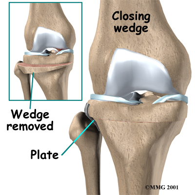 There are two methods to realign the knee joint. One involves taking out a wedge of bone; the other involves adding a wedge of bone. Any operation for cutting through a bone is called an osteotomy. In a closing wedge osteotomy, the surgeon cuts though the tibia on the lateral side, removes a wedge of bone, and pins the open edges together. In an opening wedge osteotomy, the surgeon cuts though the tibia on the medial side and opens a wedge, adding a bit of bone graft to hold the wedge open.