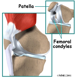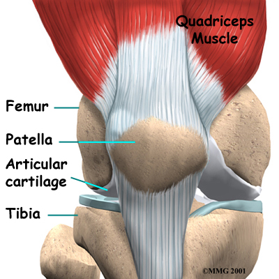 The patella, or kneecap, is the movable bone on the front of the knee. It is wrapped inside a tendon that connects the large muscles on the front of the thigh, the quadriceps muscles, to the lower leg bone. The surface on the back of the patella is covered with articular cartilage. It glides within a groove on the front of the femur.
