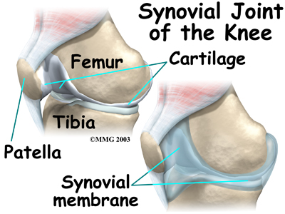 The knee joint is formed where the femur (thighbone) meets the tibia (shinbone). A smooth cushion of articular cartilage covers the end surfaces of both of these bones so that they slide against one another smoothly. The articular cartilage is kept slippery by joint fluid made by the synovial membrane (joint lining). The fluid is contained in a soft tissue enclosure around the knee joint called the joint capsule.