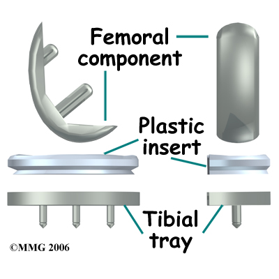 The femoral component is made of metal. The tibial component is usually made of two parts: a metal tray that is attached directly to the bone, and a plastic spacer that provides the slick surface. The plastic used is so tough and slick that you could ice skate on a sheet of it without much damage to the material.