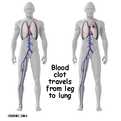 Thrombophlebitis, sometimes called deep venous thrombosis (DVT), can happen after any operation. It occurs when blood in the large veins of the leg forms blood clots. This may cause the leg to swell and become warm to the touch and painful. If the blood clots in the veins break apart, they can travel to the lung, where they lodge in the capillaries and cut off the blood supply to a portion of the lung. This is called a . (Pulmonary means lung, and embolism refers to a fragment of something traveling through the vascular system.) Most surgeons take preventing DVT very seriously. There are many ways to reduce the risk of DVT, but probably the most effective is getting you moving as soon as possible after surgery. Two other commonly used preventative measures include