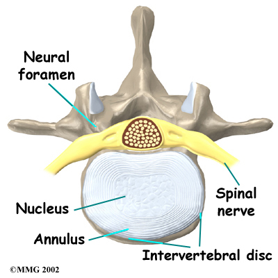 Surgeons perform lumbar discectomy surgery through an incision in the low back. This area is known as the posterior region of the low back. The main structure involved is the intervertebral disc, which acts as a cushion between each pair of vertebrae. The two main parts of the disc are the annulus and the nucleus. The lamina bone forms the protective covering over the back of the spinal cord. During surgery, this section of bone is removed over the problem disc. The surgeon also checks the spinal nerves where they travel from the spinal canal through the neural foramina. The neural foramina are small openings on each side of the vertebra. Nerves that leave the spine go through the foramina, one on the left and one on the right.