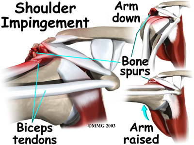 Biceps ruptures generally occur in people who are between 40 and 60 years old. People in this age group who've had shoulder problems for a long time are at most risk. Often the biceps ruptures after a long history of shoulder pain from tendonitis (inflammation of hte tendon) or problems with . Shoulder impingement is a condition where the soft tissues between the ball of the upper arm and the top of the shoulder blade (acromion) get squeezed with arm motion.