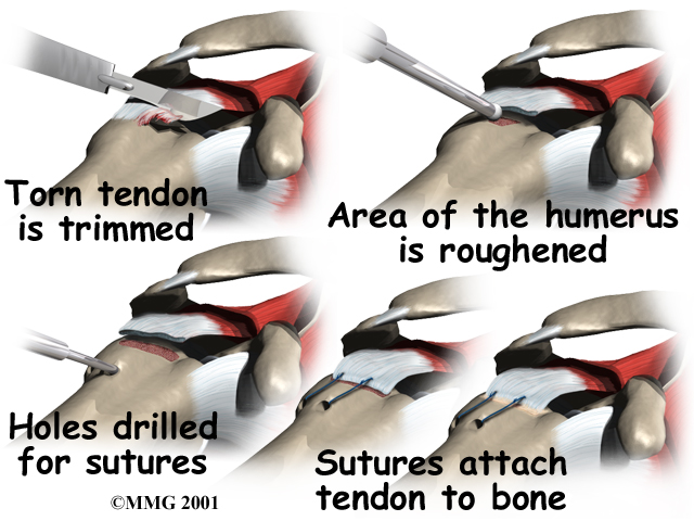 Once any degenerative tissue and bone spurs are removed, the torn rotator cuff tendon can be reattached to the bone. Special devices have been designed to reattach these ligaments. These devices are called suture anchors.