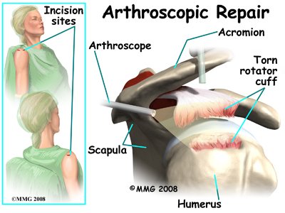 To perform the rotator cuff repair using the arthroscope, several small incisions are made to insert the arthroscope and special instruments needed to complete the procedure. These incisions are small, usually about one-quarter inch long. It may be necessary to make three or four incisions around the shoulder to allow the arthroscope to be moved to different locations to see different areas of the shoulder.