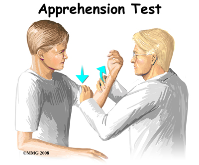 There are many clinical tests that can be performed to identify which soft tissue structures have been damaged or ruptured. A positive apprehension test is very diagnostic of an unstable shoulder that might dislocate anteriorly again after a first dislocation injury. For this test the arm is abducted and externally (outwardly) rotated by your physical therapist. Just prior to the position where the joint is about to dislocate, you may become anxious as the feeling of a potential dislocation occurs. At that point, the test is considered positive for shoulder instability and therefore discontinued.