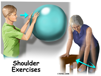 While you are immobilized simple finger movements, elbow and neck range of motion exercises should be performed. If your physical therapist or doctor has stated that your shoulder is at risk of becoming stiff, pendular (Codman) exercises (with the immobilizer removed), will also be encouraged. Pendular exercises assist with pain relief, help to maintain some shoulder range of motion, and assist in preventing unwanted scar tissue forming in the joint. These exercises are performed by leaning forward or to the side, letting the arm hang clear of the chest, and then initiating movement with your trunk so that the dangling limb passively and gently moves. This action provides some traction to the glenohumeral joint, which aids in pain relief, and also assists the shoulder into a relative elevated motion (in relation to the trunk.) It is important that the pendular activity is done as passively as possible without initiating motion from the shoulder muscles. The exercise should be similar to a weighted pendulum that randomly swings on the end of a piece of string.