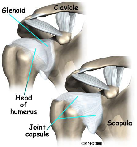 The shoulder joint is surrounded by a watertight sac called the joint capsule. The joint capsule holds fluids that lubricate the joint. The walls of the joint capsule are made up of ligaments. Ligaments are connective tissues that attach bones to bones. The joint capsule has a considerable amount of slack, loose tissue, so that the shoulder is unrestricted as it moves through its large range of motion.