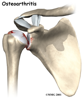 The most common reason for undergoing shoulder replacement surgery is osteoarthritis. Osteoarthritis is caused by the degeneration of the joint over time, through wear and tear. Osteoarthritis can occur without any injury to the shoulder, but that is uncommon. Because the shoulder is not a weight-bearing joint, it does not suffer as much wear and tear as other joints. Osteoarthritis is more common in the hip and knee.