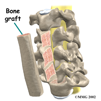 The section of bone is grafted into the space where the vertebral bones have been taken out. The graft acts like a supportive column, or strut, to support the elongated space and to prevent the neck from buckling forward. Your surgeon may attach a along the front of the spine to help lock the new graft in place.