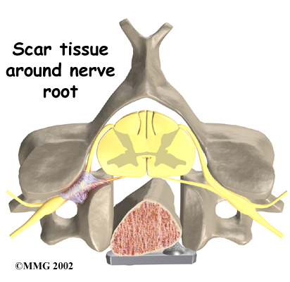 Any surgery that is done near the spinal canal can potentially cause injury to the spinal cord or spinal nerves. Injury can occur from bumping or cutting the nerve tissue with a surgical instrument, from swelling around the nerve, or from the formation of . An injury to these structures can cause muscle weakness and a loss of sensation to the areas supplied by the nerve.
